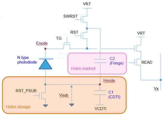 In this pixel, electron collection, storage, and readout are performed in a similar manner to the standard 4T operations. In the schematic (Figure 1), the non-highlighted part represents the electron circuitry with a dual CG 5T architecture. Such an arrangement allows for a single-exposure dual CG true CDS (correlated double sampling) readout with a seamless connection between modes [10,11]. Thus, more than 25 ke− can be read with perfect quality thanks to the 160 µV/e− high-conversion gain associated with the 30 µV/e− low-conversion gain and the 800 mV linear swing on the column.