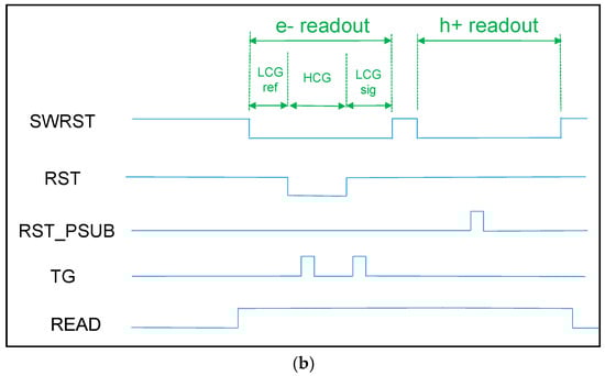 The pixel timing for low CG gain is presented in Figure 3a. After an initialization period for cleaning the photodiode and the substrate, TG and RST_PSUB are turned off, which enables the start of electron and hole integration. During this integration, the CDTI capacitance C1 is used to store the holes in the substrate while limiting the substrate voltage increase.