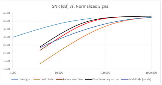 In the case of the dual diode concept, the 3× lower noise does not compensate for the 10× signal reduction, and leads to a 10 dB SNR gap. Cancelling the ktc noise is not effective enough to close that gap in the region of interest, highlighting that shot noise is also a strong SNR detractor for the dual diode.