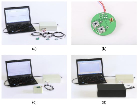 Near-infrared spectroscopy (NIRS) device. (a) Three parts of the device: the software in a computer, the three probes, and the functional module; (b) a probe with one light-emitting diode (LED) source and two sensors; (c) a device with the probe stuck on the solid phantom; (d) a device working with the probe and phantom inside a full dark box.
