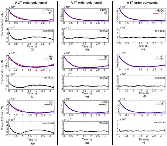 A comparison of the level of fitting among the fourth-order polynomial, the fifth-order polynomial, and the widely used second-order polynomial is shown in Figure 2. The typical probe, Probe 3 Channel 1, was taken as an example. The left axes (Figure 2a,d,g) are spectra that used the second-order polynomial, whereas the middle axes (Figure 2b,e,h) used the fourth-order polynomial and the right axes (Figure 2c,f,i) are spectra that used the fifth-order. Each pair of graphs consists of the original hemodynamic parameters and fit at the top, and the residuals at the bottom. Blue dots represent original data and red dots show the fit in the top graph. Black dots represent the residuals between the original data and fit. Apparently, the fit in the middle and on the right is closer to the original hemodynamic parameters than the fit on the left, and this demonstrates that the fourth-order and fifth-order polynomial functions fit better. Clearly, the residuals in the middle and right graphs (Figure 2b,c,e,f,h,i) are closer to zero and more stable than those from the second-order polynomial (Figure 2a,d,g). From the perspective of fitting a curve, the fourth-order and fifth-order polynomials undoubtedly provide better fit.