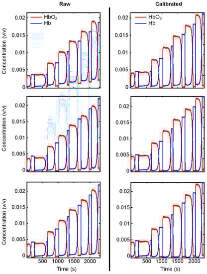 To verify the feasibility of fourth-order polynomial function for fitting, we performed an experiment with the function embedded system using human blood samples [35]. Data are shown with and without calibration. As shown in Figure 3, the left axes are data of HbO2 (oxygenated hemoglobin) and Hb (deoxygenated hemoglobin) quantified with three extinction coefficient datasets without calibration, whereas the right axes are those with calibration. The fourth-order polynomial was found to effectively remove baseline shift, successfully suppressing the primary curve downwards.