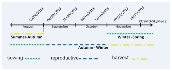 The study uses COSMO-SkyMed (CSK) SAR data at X-band (9.6 GHz). COSMO-SkyMed is a constellation of four satellites, named CSK-1, CSK-2, CSK-3 and CSK-4. The data used were collected by CSK-2 with StripMap PingPong mode, of 17 km swathwidth at 10 m resolution, HH and VV polarizations and 16 days repeat cycle, at incidence angle of 45°–47°, and in descending mode. This study uses seven images covering the Chau Thanh and Thoai Son districts in An Giang Province from 19 August to 23 November 2013. Figure 2 shows the CSK data acquisition dates together with the calendar of the main rice crops during this period including the end of Summer-Autumn season in August, early stage of Winter-Spring season in November and most of the Autumn-Winter season (Table 1).