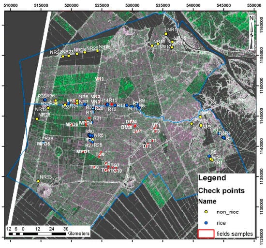 The collection of ground data is necessary to the understanding of the radar backscatter for algorithm development, and also for result validation. For algorithm development, forty rice fields located in Chau Thanh and Thoai Son districts were surveyed. To ensure low uncertainties in the mean radar backscatter over sampled fields, the fields were selected to have an area greater than 0.5 ha. For accuracy assessment of the rice mapping result, the rice growing acreage of 15 communes (the smaller administrative subdivision of a district) in Thoai Son district, obtained from the An Giang statistics office is used. Figure 3 shows the location of the 40 sampled rice fields and a number of non-rice check points in the Chau Thanh and Thoai Son districts, An Giang Province.