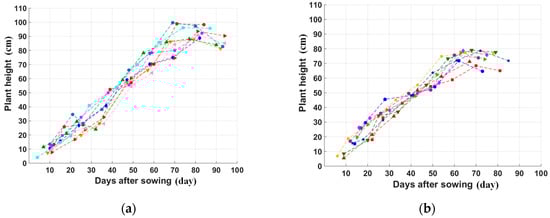 Temporal variation of plant height (versus days after sowing): (a) 9 sampling fields for long-cycle rice plants; (b) 9 sampling fields for short-cycle rice plants. The fields have been chosen to have close sowing dates and same planting practices.