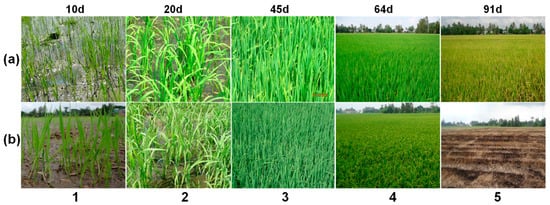 Ground survey photos at 10, 20, 45, 64, 91 days after sowing: (a) Long cycle rice variety, (b) Short cycle rice variety.