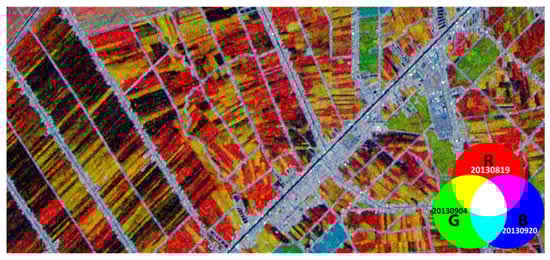 Example of RGB combinations of different dates (R: 19/08/2013, G: 04/09/2013, B: 20/09/2013) from CSK images, HH polarization over rice fields in the An Giang Province.