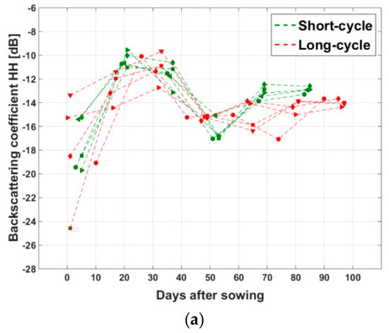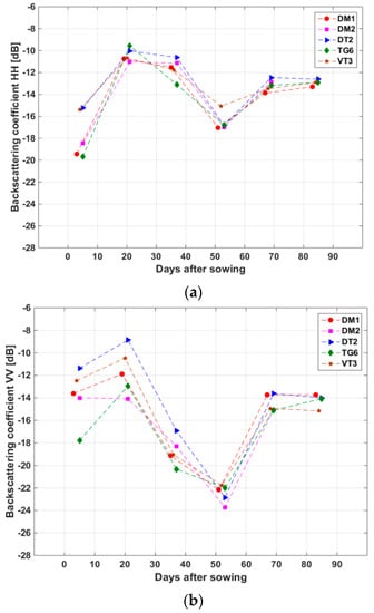 It is interesting to note that the temporal variation of HH/VV follows well the plant growth, similarly to optical indicator such as Normalized Difference Vegetation Index (NDVI), confirming previous findings [,,]. This is because the ratio reduces the effect of ground surface in the backscatter, maximizing the sensitivity to plant growth.