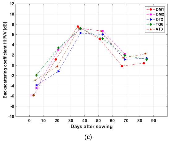 Variation of (a) HH, (b) VV backscattering coefficient, and (c) HH/VV of the five selected short-cycle sampled fields extracted from CSK images of six dates, versus the sowing date of each field.