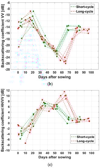 Variation of (a) HH, (b) VV backscattering coefficient, and (c) HH/VV of the 5 selected short -cycle sampled fields (in green), and 5 long-cycle fields (in red) extracted from CSK images of 6 dates, versus the sowing date of each field.