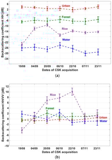 Temporal variation and standard deviation of (a) HH backscattering coefficient and (b) polarization ratio HH/VV of the four LULC sampled classes: forest in green, urban in red, river (water) in blue and rice in violet, extracted from CSK images of seven dates.