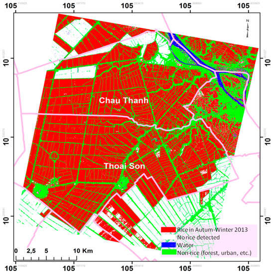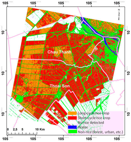 The achieved maps in this study include general LULC and rice growing areas sowing date map and long/short cycle rice map for Autumn-Winter rice season in 2013 in the CSK frame covering Chau Thanh and Thoai son districts, in the An Giang Province. For results validation, a standardized validation method (e.g., including sampling strategy and design, response design, etc., as proposed in []) should be applied. However, due to the time and budget constraints, we have used only the (64) independent GPS check points and the agency statistics published well after the rice season for rice/non rice mapping accuracy. For more statistically sound validation, a higher number of GPS check points is preferable in future experiments. For long/short cycle rice and sowing date, we have used the 40 surveyed fields, from which 10 random fields are used for training and 30 fields for comparison with the results. The maps can be used at local scale for planning of farm activities, for organizing labor at the right time. It also provides accurate information for the local government, planners and decision makers, to assess the rice grown area for each rice season, and to have early estimation of long and short cycle rice with different market values. However, for province and national scale mapping, the coverage of the X-band SAR (17 km) is a limitation. In this case, large coverage data with frequent repeat cycle such as Sentinel-1 will be more adapted.