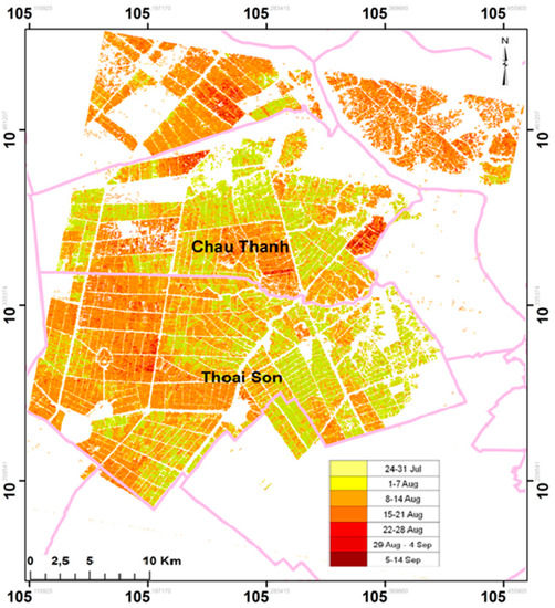 Figure 12 shows the rice sowing dates map of the Autumn-Winter crop in Chau Thanh and Thoai Son communes. The result indicates clearly that the sowing dates span from the end of July to mid-September, although the common knowledge for Autumn–Winter crop sowing period in the region was restricted to Middle August. The result shows that at the Northern part of the study site, sowing dates tend to be later than Middle August, and at the Southern part, mixed earlier and later sowing dates are found.