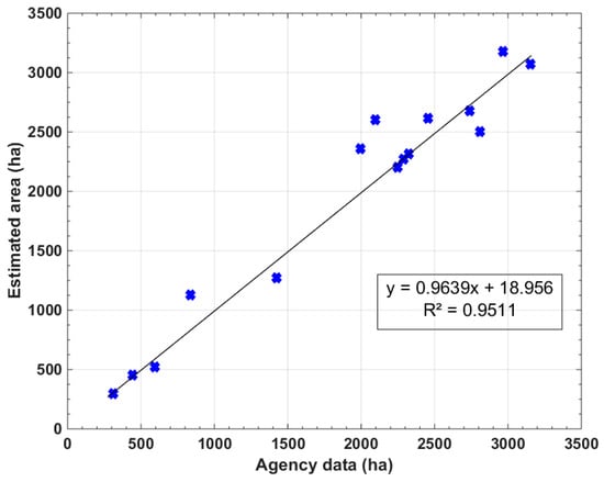 Estimated area in Autumn-Winter crop by CKS vs. agency data of 15 communes in Thoai Son districts, An Giang Province. Black line represents the linear regression between two datasets.