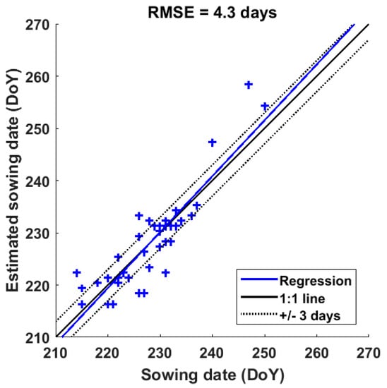 The sowing date map derived from CSK data is compared with the sowing dates of 30 sampled fields showing a good agreement with a root mean square error of 4.3 days (Figure 15).