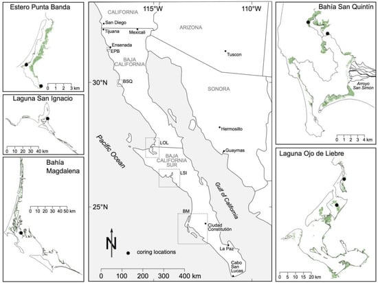 Previous studies have focused on establishing wetland change rates over time and on determining country or habitat-level coastal wetland C stocks. Long-term wetland change has been calculated by comparing contemporary and historic wetland distribution patterns based either on historic maps [,] or potential distributions estimated using soil and topographic data [,]. For more recent time periods, wetland change has been calculated using aerial photography or satellite imagery []. Stocks and rates of C sequestration are calculated using an inventory of sediment cores analyzed for organic C density collected from the environments under consideration [,,]. Although previous work has focused on both wetland change [] and C sequestration [] in Baja California, past studies have not considered the full holistic context necessary to manage C stocks for sustainability. This includes information on past and future losses to coastal development or disturbance, as well as natural geomorphological processes that lead to wetland creation and destruction []. Information on responses that are occurring due to climate change, including losses due to drowning [] or increases due to upslope migration [] are relevant, as well as assessments of sediment source and potential disruptions to sediment transport pathways that may threaten wetland survival []. Lastly, understanding the source of C preserved in wetland sediments, as well as interactions with climatic and environmental gradients, can provide important insights into the coastal C cycle [].
