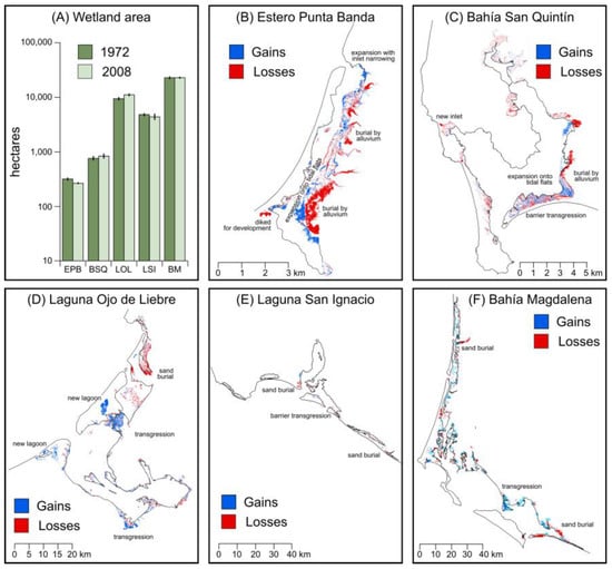 Changes in tidal wetland extent at five Pacific Baja California lagoons: (A) an overall gain of 3.9% was estimated, although considerable variability was found from site to site; (B) at Estero Punta Banda, wetlands were lost to diking and burial by alluvium; gains occurred as wetlands prograded onto tidal flats; (C) at Bahía San Quintín, wetlands were lost to barrier rollover and burial by alluvium; gains occurred as wetlands prograded onto tidal flats; (D) at Laguna Ojo de Liebre; (E) at Laguna San Ignacio; (F) at Bahía Magdalena, dunes buried wetlands, and wetland transgression occurred.
