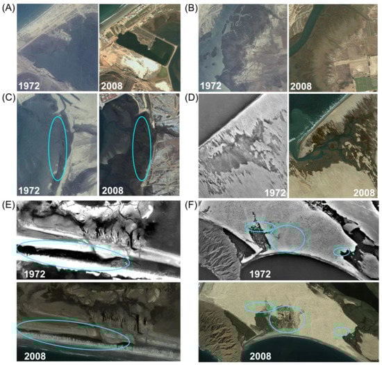 Images of changes in wetland area between 1972–2008: (A) at Estero Punta Banda, wetlands were lost to diking; (B,C) at Estero Punta Banda, wetlands were buried by sediment, and expanded onto former mudflats; (D) at Laguna Ojo de Liebre, a new lagoon formed; (E) at Laguna San Ignacio, dune rollover buried marsh by sand; (F) at Bahía Magdalena, wetland transgression occurred, and wetlands were buried by active dunes. 2008 imagery from Google, Digital Globe.