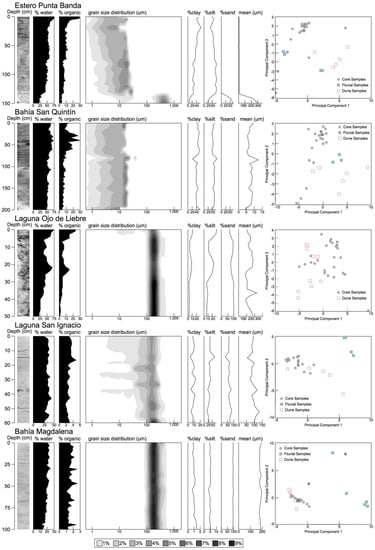 The 18 geochemical variables were effectively reduced to two principal components, which explained 61%, 67%, 68%, 69%, and 85% of the variability in the elemental data for lagoons Estero Punta Banda, Bahía San Quintín, Laguna Ojo de Liebre, Laguna San Ignacio, and Bahía Magdalena, respectively. Eigenvalues for the two principal components were 14.0, 14.3, 15.6, 13.8, and 17.0. For the three southerly lagoons, most of the sediment was large-grained (sand sized; >62.5 μm), and the results of the PCA analysis (Figure 4) suggested that the sediments geochemically matched sediment samples that had been collected from active dunes abutting wetlands. For the northerly lagoons, sediment samples were finer grained (lacking sand), and poorly matched both dune and fluvial sediment samples. Clear laminations, or variations in sediment grain size, which are both indicative of episodic sediment deposition events, were not found in x-radiographs or sediment grain size profiles. For Bahía Magdalena, wetland sediments were well sorted, as is typically found for aeolian transported sand; at the four other lagoons, sediments were poorly sorted, as is more typical for fluvially or tidally transported sediment []. Analyses show that sediment accumulation for Baja California tidal wetlands occurs primarily as mineral sediment, rather than via peat formation, as values are below the cut-off for organic soils (~20% organic) (Figure 4; Table 3).