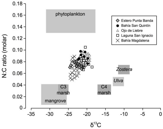 Molar nitrogen:organic C ratios (N:OC) vs. δ13C values for wetland sediments from five Pacific coast lagoons. Values of potential end-members are derived from previous studies [,,,,,].