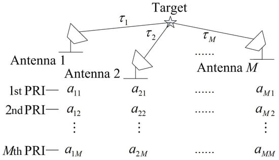 The matrix is used to construct the transmitted waveforms for a distributed multistatic radar system with antennas that can both transmit and receive signals. Consider a static point target illuminated by the radar system as shown in Figure 1, where to are the round-trip delay values between the target and each antenna. Antenna m transmits the sequence in the p-th () pulse repetition interval (PRI) and receives echoes from all antennas, which are the radar returns’ delayed versions of . The complementary sets on each antenna are modulated by a baseband pulse , yielding the following time domain waveforms: