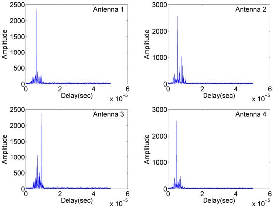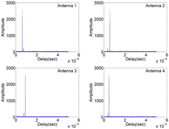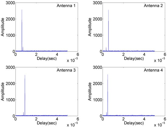 In the simulation, we consider a scenario with four antennas. A matrix of complementary sets is generated for transmission. The bandwidth of the radar is . The sampling rate is . The PRI is . Each entry of the matrix has chips of values in the chip interval . The locations of Antennas 1—4 in the scenario are set to be , , , , respectively. Two point stationary targets are assumed at and with the magnitude and , respectively. Radar returns at all antennas are contaminated by complex Gaussian zero-mean white noise with a mean magnitude of .