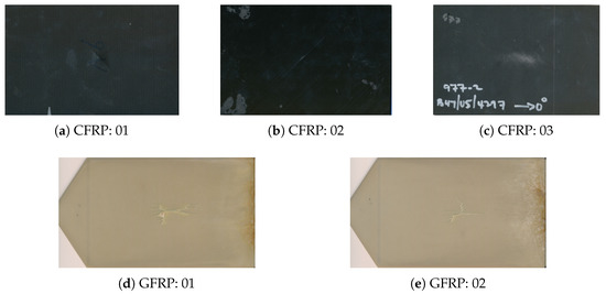 In this paper, the tested samples include three CFRPs and two GFRPs as shown in Figure 1. CFRPs 01/02 were tested with a low-velocity impact blind test. CFRP 03 included the unbalanced structural distribution of resin and preform. Their dimensions are 10 cm × 15 cm and their thickness are ∼2 mm, ∼4 mm and ∼5 mm, respectively. GFRPS 01/02 were made of Nylon matrix and short glass fiber. Their dimensions excluding the triangle heads are 12 cm × 15 cm and their thicknesses is ∼3 mm. The impact energies were 7.5 J and 6 J, respectively.