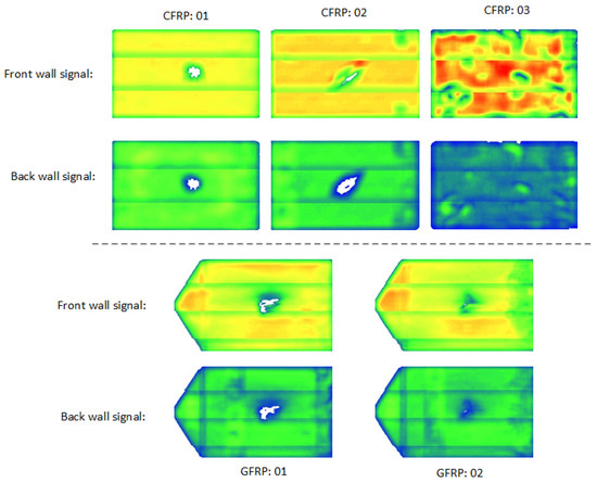 Ultrasonic C-scan testing (UT) was first applied on the tested samples in order to find the defects prior to the infrared testing. A phased-array (PA) probe with a frequency of 2.25 MHz was used. The experiments were conducted in reflection mode and the C-scan images are shown in Figure 2. Every image is composed of three PA scanning images. The front wall reflection signal images indicate the defects near the surface, while the back wall signal images represent the defects far from the surface. In the CFRP results, the impact damage areas and resin/preform abnormalities are clearly seen. In the GFRP results, 7.5 J (GFRP 01) leads to a stronger impact damage than 6 J (GFRP 02). The UT results provide a good reference for the study of the infrared thermographic imaging approaches.