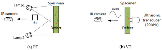 As an ultrasonic excitation thermographic approach, vibrothermography (VT) was also used in this work. Different from PT, VT uses ultrasonic waves to stimulate a subsurface defect without heating the surface. The stimulation of the subsurface defect causes a complex combination of absorption, scattering, beam spreading and dispersion. The ultrasonic waves spread towards all of the orientations in the form of heat [9,10]. Figure 3b shows the schematic configuration for VT. The excitation ultrasonic waves frequency was 20 kHz and the signal modulated frequency was 0.2 Hz. The frequencies work well for a variety of applications [11]. The same infrared camera was used to record two heating/cooling circles.