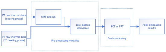 Pulsed phase thermography (PPT) [22] can be used to extract amplitude and phase information from the raw thermal data. It provides the possibility to obtain quantitative results in a straightforward manner. Usually, phase is more useful than amplitude because it can retrieve the deeper information. In addition, phase is less affected than raw and amplitude data by environmental reflections, emissivity variations, non-uniform heating, surface geometry and orientation [10]. Therefore, PPT was used as a post-processing technique in this work. Figure 4 shows the flow chart of the entire infrared image processing modality.