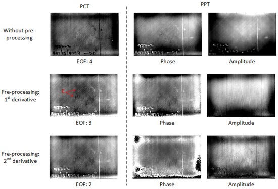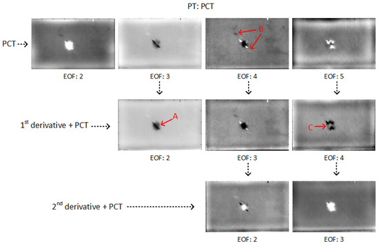 Figure 5 shows the PCT results in PT for CFRP 01. In the results without pre-processing, more EOFs are required to indicate the defects/features. After pre-processing, less useful EOFs are needed from PCT because the pre-processing reduces the surface and surrounding noise, e.g., surface feature B (marked in red). Therefore, the pre-processing reduces the complexity of the result analysis for PCT. Moreover, the deeper impact damage can be detected more clearly such as A marked in red, and more impact damage (also deeper) can be seen such as C marked in red. Specifically, the 2nd-derivative can reduce the surface/surrounding noise more than the 1st-derivative and less useful EOFs are needed in the results after the 2nd-derivative pre-processing than after the 1st-derivative pre-processing. However, as a pre-processing modality, the 2nd-derivative can also eliminate some useful impact damage information such as C marked in red.