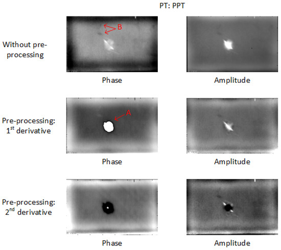 Compared with PCT, PPT can show a more obvious impact damage area as shown in Figure 6. After the pre-processing, the impact damage (marked A in red) is easier to identify and the surface noise (marked B in red) can be reduced more than in PCT. The phase images show more information than the amplitude images, but they can also lose some useful impact damage information such as A marked in red, which is similar to the results in PCT after the 2nd-derivative pre-processing.