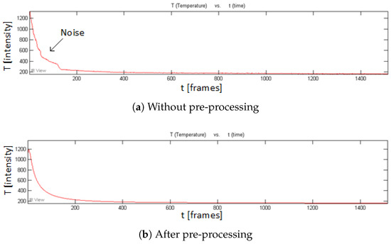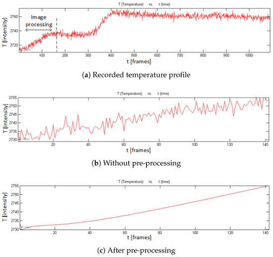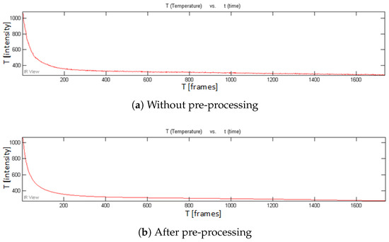 Figure 7 shows the recorded temperature profile curves for a given pixel in a non-defective area in the cooling phase in PT for CFRP 01. It can be seen that the temperature curve is effectively smoothed after the pre-processing in PT, although the effect is not as strong as in the VT curves as shown in Figure 8b,c. Only the 1st heating phase is used for pre-processing (see Figure 8a). A study has shown that more useful defect information can be obtained in the heating phase than in the cooling phase in VT [11]. Because the pre-processing smooths the VT heating phase signals more intensively, the VT results after the pre-processing should show an obvious increased performance in comparison to the results without the pre-processing. This prediction can be verified in the VT results as shown in Figure 9.