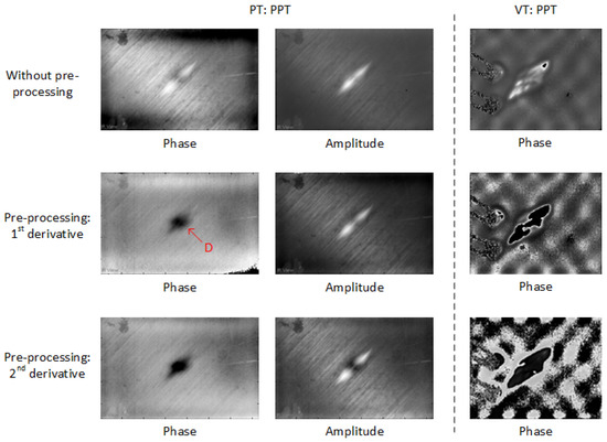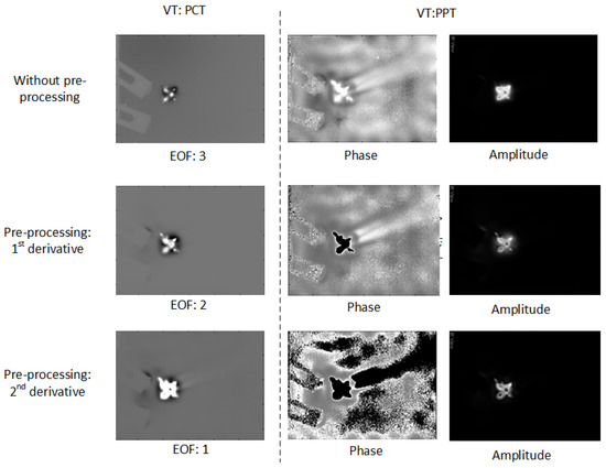 Figure 9 shows the VT results for CFRP 01. In the PCT results, a larger impact damage area can been seen after the pre-processing along with the increase of the derivative order. In PPT, the pre-processing can reduce the surrounding noise, but it can also eliminate some useful information similar as in PT.