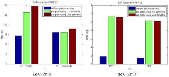 SNR values provide important information about the sensitivity of each technique when comparing the detectability of similar features or defects. Therefore, SNR analysis is used herein as a means to evaluate and compare the sensitivity of the applied processing techniques [6]. Obviously, the SNR values in Figure 14 validate the effect of the pre-processing modality.