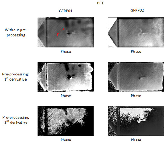 The pre-processing does not provide more defect or feature information in PT for GFRPs as shown in Figure 15. The deeper impact damage cannot be seen in the thermographic results and the results after 2nd-derivative pre-processing are foggy. This is probably due to the fact that the GFRP samples are semi-transparent; hence, some infrared radiations pass through the specimen and another part actually heats the surface. Further tests should require the sample to be painted. In addition, GFRP is a bad conductor of heat compared to CFRP, so heat propagates more difficulty [23]. Still, a defect/feature F (marked in red) can be seen, which is not detected by UT (see Figure 2). It might be caused by the shallow-depth resin abnormality, which is not flat so that it does not reflect the ultrasonic signals. However, it cannot be at a deeper depth as explained above. An alternative NDT method such as Terahertz imaging should be more suitable for this type of material [24,25,26,27].