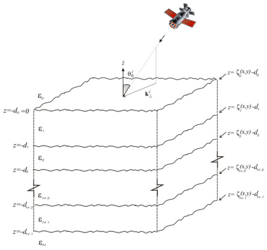 Another approach relies on the perturbation theory [9,10,11,12,13,14,15,16,17,18,19,20,21]. Within this framework, two different systematic formulations have been recently introduced to deal with the analysis of a layered structure with an arbitrary number of rough interfaces. Specifically, the results of the Boundary Perturbation Theory (BPT) [12,13,14,15] lead to polarimetric, formally symmetric, and physically revealing closed-form analytical solutions. In this case, a suitable perturbation pertinent to the structure geometry is concerned. The volumetric-perturbative reciprocal theory (VPRT) for the evaluation of the scattering from a layered structure with an arbitrary number of rough interfaces considers a perturbation pertinent to the dielectric properties of the structure [18]. It is important to note that both BPT and VPRT lead to formally identical expressions of the first-order scattered field. A complete physical interpretation of the relevant analytical solution has been presented in [16]. A comprehensive discussion on the relevant domain of applicability is also provided in [21]. Note that also higher-order perturbative solutions are available [19,22,23,24], but they require the numerical evaluation of integrals, thus losing most of the advantages of analytical methods mentioned above. Accordingly, we here focus on first-order solutions.