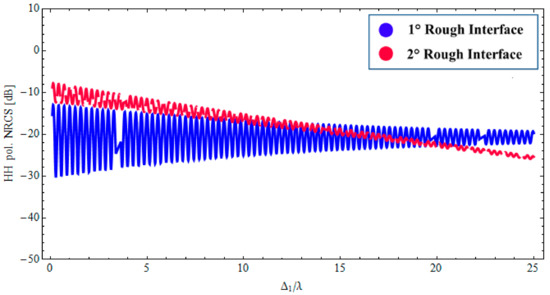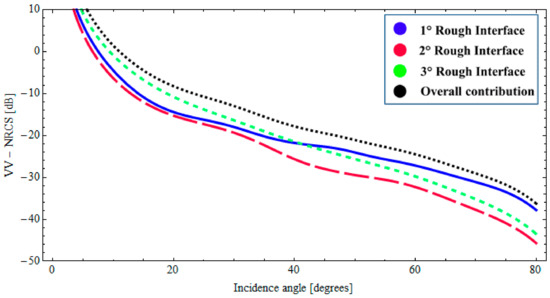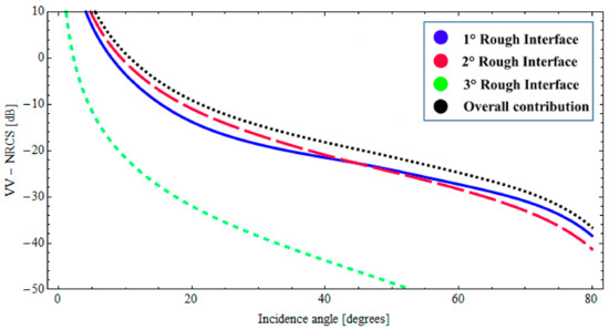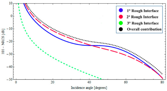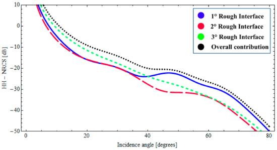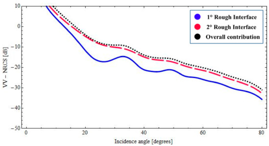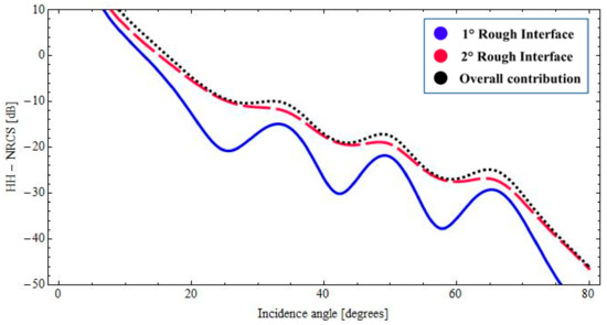 With reference to the geophysical structure described above, in Figure 2 and Figure 3, we show the backscattered NRCS, as predicted by the BPT-fBm model, as a function of incidence angle for the horizontal (HH) and vertical (VV) polarization, respectively. We have assumed a sand thickness ∆1 = 1.20 [m] in both cases. In Figure 2 and Figure 3, the contributions of the first and second fractal interfaces are represented, respectively, by the solid (blue) line, the long-dashed (red) line. In addition, the overall contribution is also depicted (dotted black line). As we can recognize from the graphs of Figure 2 and Figure 3, total backscattering is mainly generated by the sand–paleosoil interface. These results are in accordance with the experimental evidence obtained in [1,2,34]. A more quantitative comparison with these experimental results would be desirable. However, in [1], no roughness information is provided. In [2,34], as in most electromagnetic scattering experiments, the surface roughness is described in terms of classical parameters (standard deviation and correlation length), which cannot be univocally translated in fractal parameters S0 and H without knowledge of the size of the illuminated area (see [29]). Accordingly, no fully quantitative comparison can be performed with these results, and only the qualitative one reported here is possible.