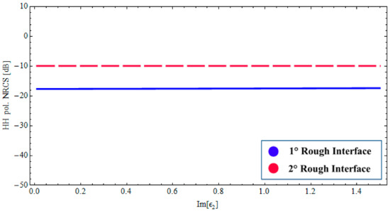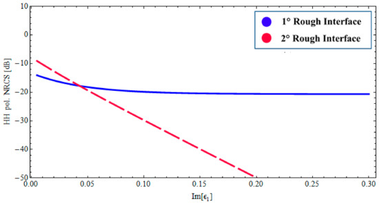 We first explore the dependency on the losses in the sand layer, which is crucial for subsurface structure sensing. Accordingly, we analyze the backscattered NRCS, as predicted by the BPT-fBm model, as a function of imaginary part of the complex permittivity ε1. This dependency is depicted in Figure 4, for a fixed incidence angle ( 35°) at 1.6 GHz, and the horizontal (HH) polarization case only. We assume the same fractal description as in Figure 2 and Figure 3. In Figure 4, the contributions of the first and second fractal interfaces are represented, respectively, by the solid (blue) line and the long-dashed (red) line. As can be seen, the sensitivity to the losses in the sand layer is significantly different for the scattering contributions pertinent to the air–sand and sand–paleosoil fractal interfaces. In particular, as the losses in the sand layer increase, the scattering contribution associated with the buried interface decreases rapidly, whereas the upper-interface contribution remains essentially unaffected. This behavior is closely related to the inherent penetration depth. Conversely, the radar signature is not affected by losses variation (within the physically meaningful range) in the wet paleosoil, as is evident in Figure 5.