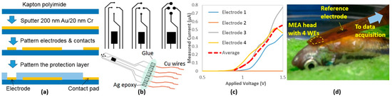 Prior to experiments, in order to validate connectivity and characterize the performance of the fabricated electrodes, each MEA membrane was immersed in a saline solution while applying a range of voltages between 0 V and 1.5 V across the WEs and RE. The resulting currents were then measured. The characterization result of a 300-µm MEA membrane is plotted in Figure 1c.