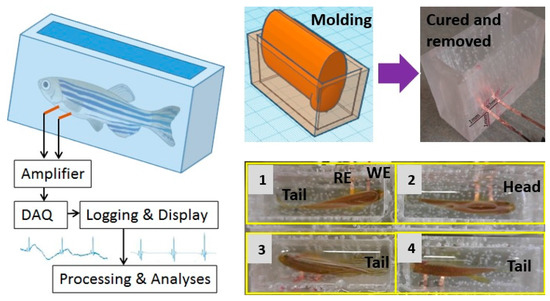 The in-house apparatus included a multiple-chamber housing made of polydimethylsiloxane (PDMS) using 3D-printed molds with embedded flexible electrodes. The molds were designed using the online-available software TinkerCAD (Autodesk, Inc., Mill Valley, CA, USA) and then formed using a 3D printer. We used two 3D-printed parts, a rectangular tank with an inner length of 53 mm and inner width of 25 mm, and an oval-shape object with a length of 44 mm and a maximum width of 14.7 mm (Figure 2, right panel). First, PDMS (Sylgard 184, Dow Corning, Midland, MI, USA) was cast into the rectangular object and then the oval mold was positioned to form the tapered housing. After PDMS was cured at room temperature in 24 h, the molds were gently removed to make sure the apparatus remained the desired shape. To form the recording electrodes, two strips of 125 μm-thick polyimide (Kapton, DuPont, Wilmington, DE, USA) with sputtered metals were inserted from the side of the apparatus through two thin-cut slits, which were then sealed by applying PDMS. The electrode strips were positioned so that when the fish was loaded into the apparatus, the two electrodes would be securely in contact with the chest and abdominal areas, acting as recording and reference electrodes, respectively. Multiple apparatuses can be used simultaneously for measurement. Figure 2 (lower right panel) demonstrates a setup of four awake zebrafish ready for ECG recording.