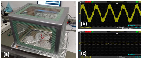 (a) The in-house Faraday cage; (b,c) Ambient EMI without and with Faraday cage.