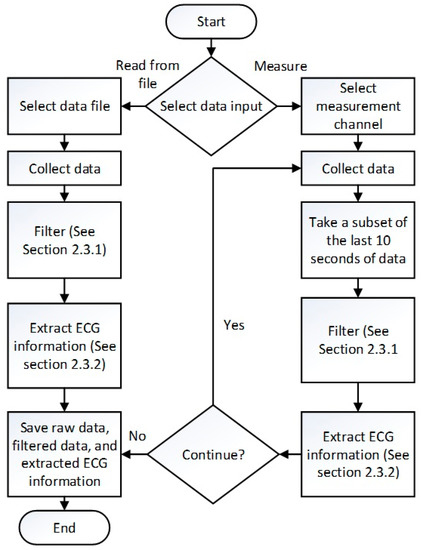 To collect, process, and analyze the ECG data, a program was created in LabVIEW (National Instruments, Austin, TX, USA). An overview flowchart of the program is showed in Figure 4. Upon starting the program, the user is first presented with the choice to proceed forward using previously acquired ECG data read from a file or measuring live data.