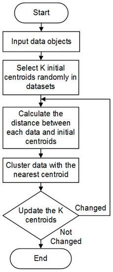 K-means works by partitioning data into k-numbers of clusters with one centroid defined for each cluster. The initial values of the centroids may be randomly selected. For each data point, the distance to each cluster is calculated. If the data point is closest to its initial cluster, the data point is left in that cluster, otherwise it is moved to the closest cluster [32]. This is repeated until a complete pass is made. The details of this approach are illustrated in Figure 5.