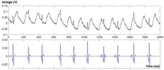 ECG signals, raw (upper) and de-noised (lower), recorded from an awake fish, using our newly developed PDMS apparatus.