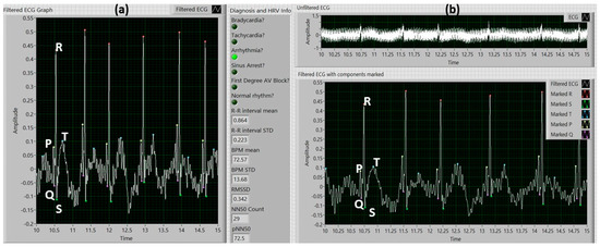 The front panel of the main VI with a raw ECG signal and its filtered waveform, is showed in Figure 7b. All P waves, QRS complexes and T waves were successfully detected. For this particular signal, the success rates for peak detection was 100% for P, Q, R, S, and T peaks when compared to the peaks detected manually. The noise was reduced from approximately 1 mVpp to 0.05 mVpp, before and after de-noising, respectively. Table 1 displays a summary of the anomalies detected and the R-R intervals in which each was present.