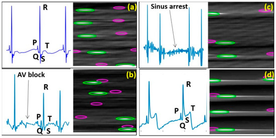 Exemplary standard ECG patterns and exemplary conversion images for CNN training to indicate general differences in the presentation of wave morphology. (a) Control fish; (b–d) Mutant lines with phenotypes of AVB, SA and STE, respectively. Green: R peaks; Pink: P peaks.
