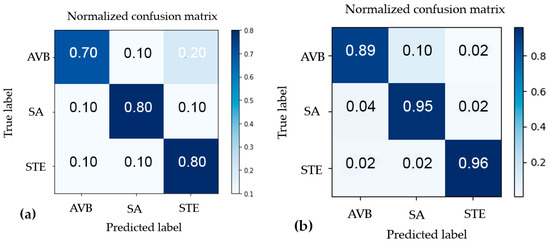 To ensure the validity of these approaches, 10-fold cross validation was employed, where the models were trained from 9 non-overlapping data subsets and tested from the remaining subset, and this process was repeated until all sets have been used for both testing and training and the results were then averaged. Precision, recall and F1 score were used as criteria for classifier evaluation [38]. These parameters are related to True Positives and False Positives (TP/FP), which refer to the number of predicted positives that were correct/incorrect, and similarly for True and False Negative (TN/FN) [38]. Here, TPAVB, TPSA, TPSTE are true positives; FPAVB, FPSA, FPSTE are false positives; FNAVB, FNSA, FNSTE are false negatives; and TNAVB, TNSA, TNSTE are true negatives for 3 classes AVB, SA and STE, respectively. The average accuracy, precision, recall and F1 score are calculated respectively by Equations (1)–(4).