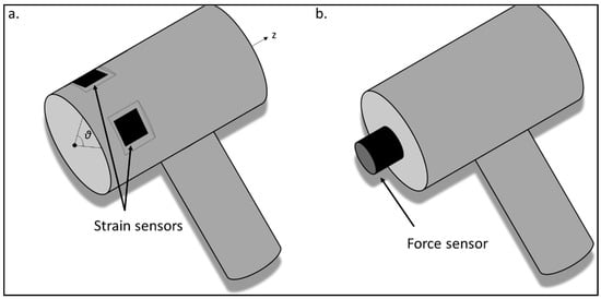 Schematic representation of (a) the strain hammer’s head instrumented with the three strain sensors and (b) the force hammer’s head instrumented with the force sensor.