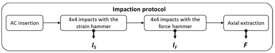 A hemispherical cavity with a diameter equal to 47 mm was initially drilled in trabecular bone. Then, an impaction procedure was carried out with a 48 mm diameter AC implant and consisted in four steps as described in Figure 3. Firstly, the AC implant was inserted within the bone cavity until achieving a suitable stability without damaged the host bone. Secondly, the ancillary was impacted four successive times using the strain hammer, with the constraint that the maximum of the sensor’s elongation should be comprised between −1 and −3 nm, which corresponds to a weak impact energy compared to the ones employed to insert AC implant. The value of the indicator Is was determined using Equation (2) for each of the four impacts and then averaged in order to obtain the average value of the indicator Is for the corresponding configuration. In order to assess the reproducibility of the estimation of , the measurement was carried out three additional times and the average and the standard deviation values (denoted and ) obtained for the four values of were determined.